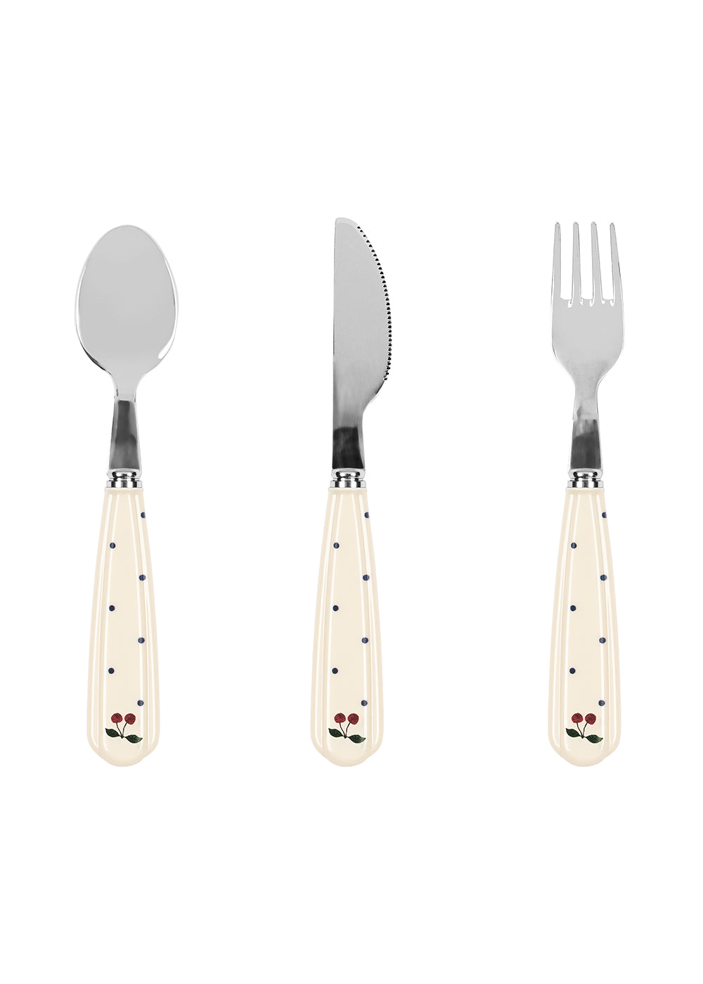 Ensemble de couverts orné d'un joli imprimé cerises signature Konges Sløjd et d'une forme ondulée.