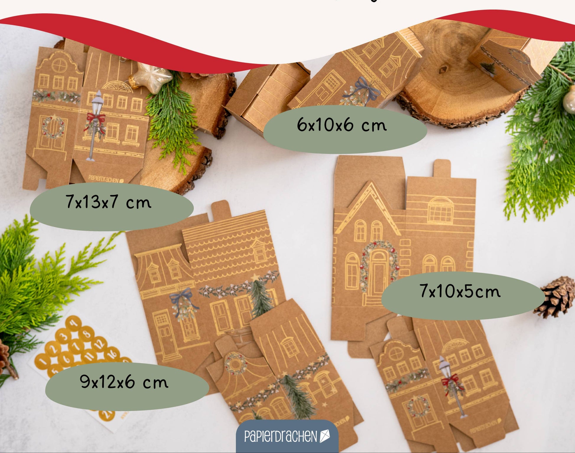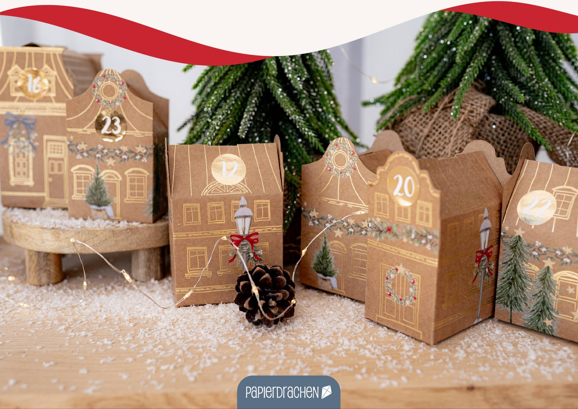 Un magnifique calendrier de l'Avent conçu comme une vieille ville de Noël en papier d'emballage brun aux accents dorés pour plier et décorer vous-même les rebords de fenêtres ou les commodes.