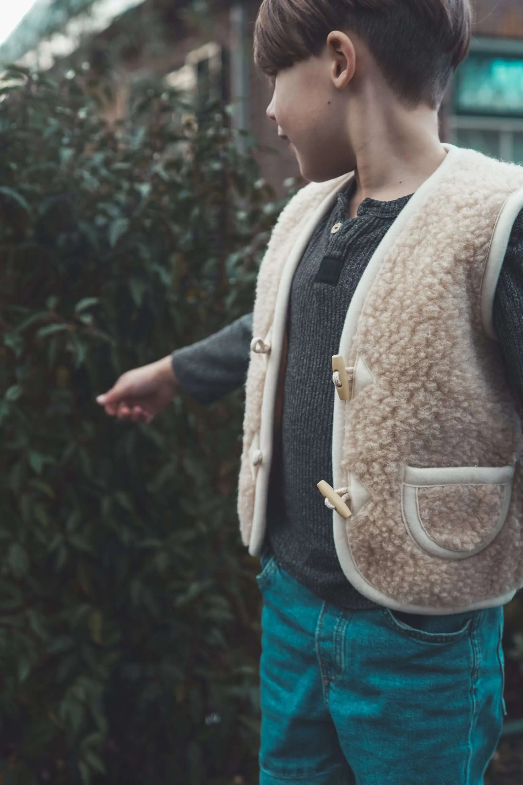 Les gilets sont, selon la taille, fermés avec 1 ou 2 boutons en bois à la mode et ont des poches à partir de la taille 98/104.