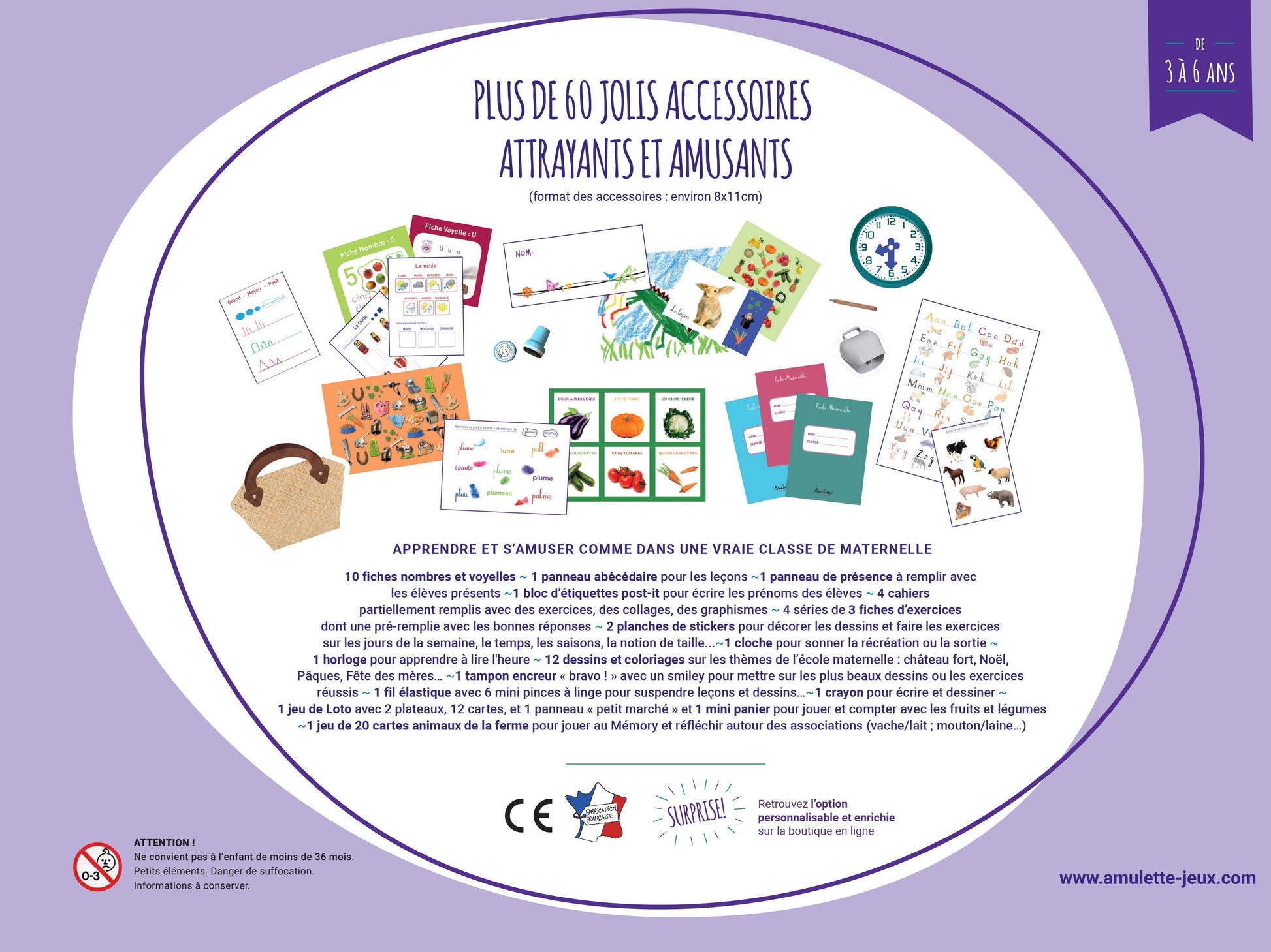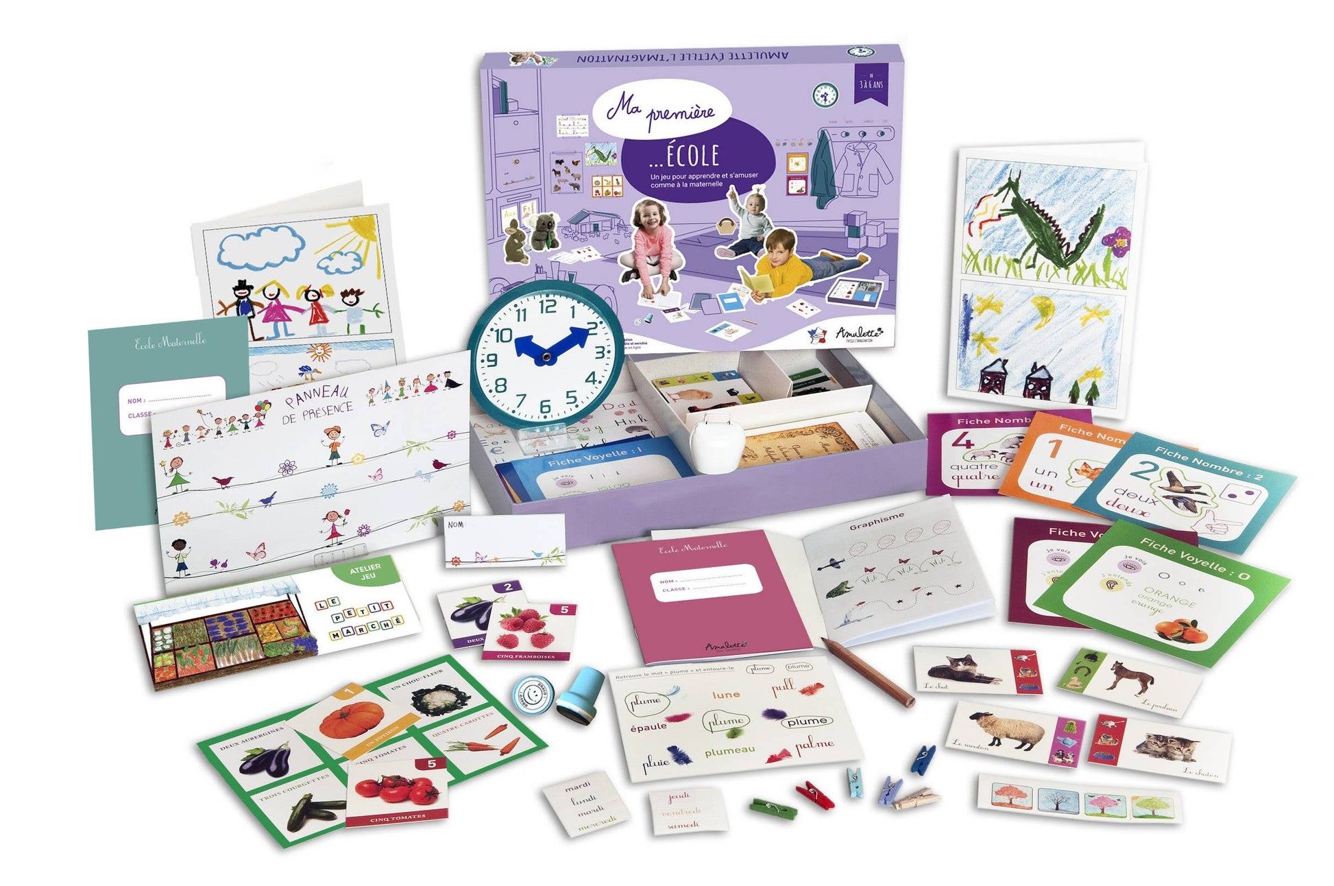 Un jeu pour que les 3-6 ans apprennent et s’amusent comme dans une vraie classe de maternelle. Plus 60 accessoires pour jouer à l'école : faire l’appel, expliquer les leçons (voyelles, alphabet, chiffres, graphismes, saisons), donner les exercices à ses élèves et jouer avec les animaux de la ferme et les fruits et légumes. Contient un tampon encreur « Bravo », une horloge factice et une cloche pour sonner la récréation !