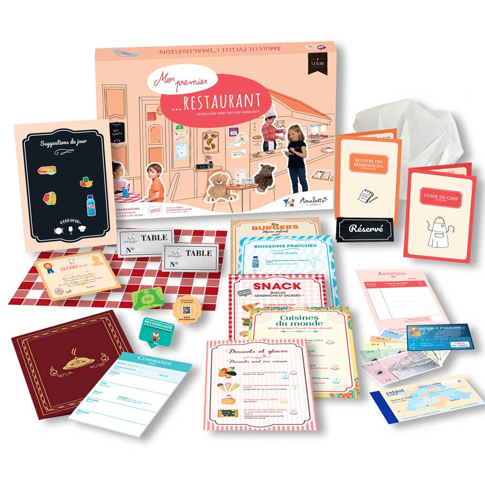 Un jeu pour recréer à la maison l'atmosphère d'une vrai repas au restaurant ! PLUS DE 40 accessoires gais, éducatifs et riches en détails pour régaler ses doudous de plats du jour - en précisant s'ils sont ou non végétariens ou healthy - et calculer les additions ! Contient une vraie carte imitation cuir avec 10 menus de styles différents (du gastronomique au food truck en passant par la cuisine thaï ou les glaces ou le café traditionnel), un carnet de commandes, un bloc d’additions, un registre de réservations, un guide pour bien préparer les tables, des pancartes. Les stickers de plats du jour et de distinction sont repositionnables. Inclut également une toque de Chef, des serviettes, une nappe, chéquier, billets et carte de paiement factices. NB : Les photos des plats du jour ont été réalisées avec des jouets ou de la pâte à modeler.
