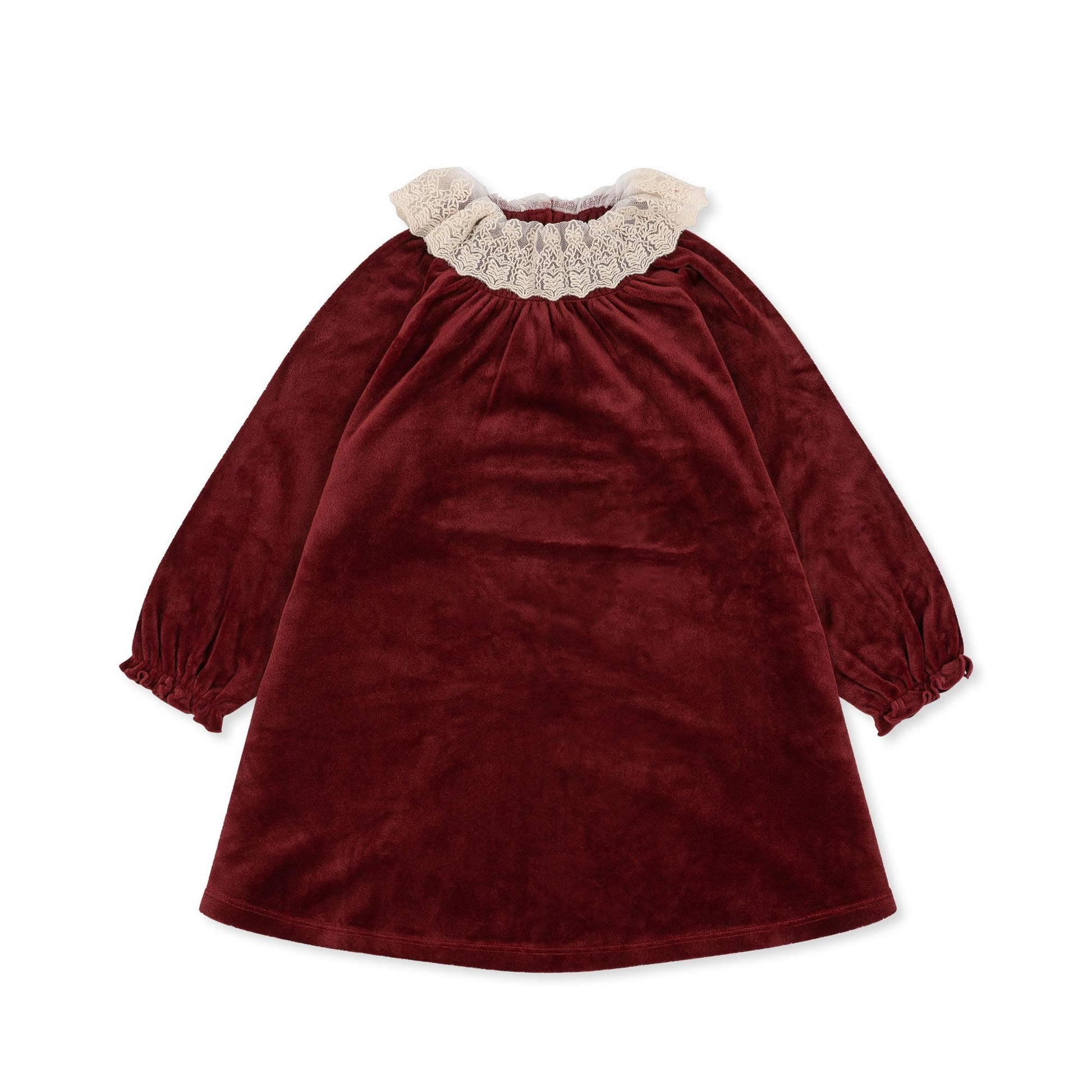 Robe en velours doux avec un col en dentelle décorative. Coupe ample et légèrement trapèze.
