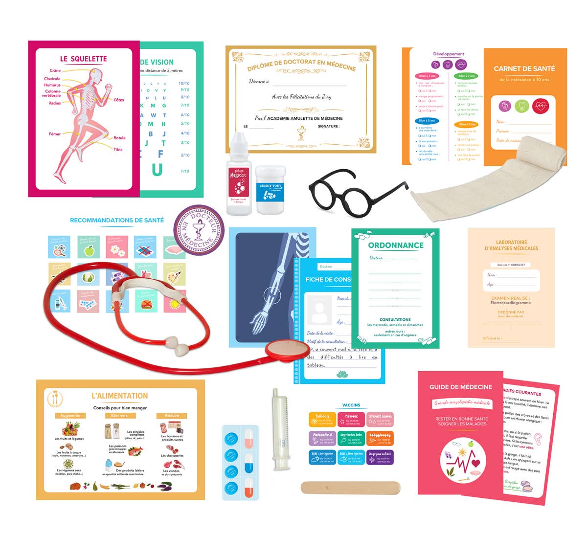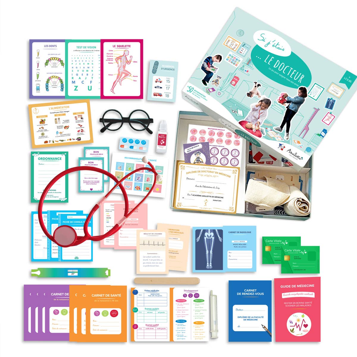 Si j’étais le docteur, un nouveau coffret un coffret amusant et instructif sur la santé pour imaginer un vrai cabinet médical. Pour les enfants qui ont une vocation de médecin, plus de 50 jolis accessoires ludiques et riches en détails : : carnet de rendez-vous, diplôme de médecin, guide de médecine, affiches sur le squelette, les numéros d’urgence, les dents ou l’alimentation, test de vision et lunettes, carnets de santé et dossier de patients, petit matériel médical (stéthoscope, seringue, bande et pansements), médicaments factices, radios et analyses, stickers « recommandations de santé », « vaccins », « boutons de varicelle » et « tampon du docteur », mais aussi des bons pour aller mieux et un livre pour la salle d’attente pour rassurer tous les petits patients ! Fabrication française
